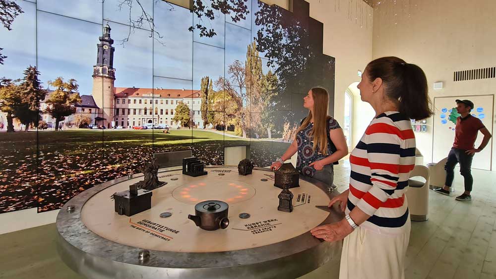 Über eine Aussichtsplattform haben Sie einen wunderbaren Blick zum Park, zur Herzogin Anna Amalia Bibliothek und zum Stadtschloss. Im luftigen Innenraum machen raumhohe Videowalls mit sieben Kurzfilmen auf ausgewählte touristische Ziele in Thüringen aufmerksam. Visuell beeindruckend führen sie in die Orte und Geschichten ein, die das Erlebnisportal in sieben thematischen Touren bündelt. Das Spektrum reicht von kultur- und gesellschaftshistorisch bedeutenden Orten bis zur Literatur und Residenzkultur: Von der „Geburtsstunde Demokratie“ in Schwarzburg, wo Friedrich Ebert die Weimarer Verfassung an seinem Urlaubsort unterzeichnete, über die „Gezähmten Landschaften“ der barocken Parks und Landschaftsgärten bis zum Thüringer Wald, wo Goethe auf dem Kickelhahn ein weltbekanntes Gedicht schrieb.