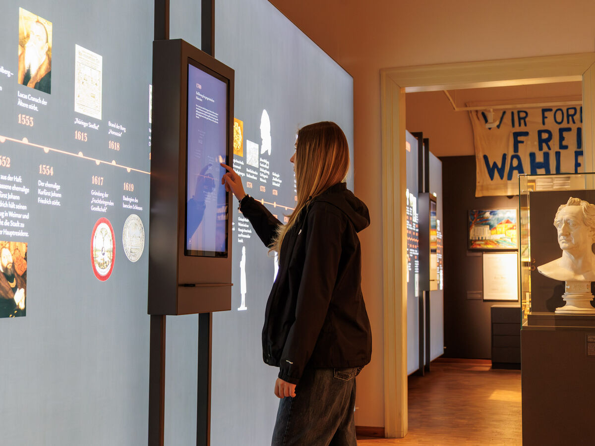 Auf zwei beweglichen Bildschirmen lässt sich die Weimarer Geschichte von den Ehringsdorfer Urmenschen bis in die Gegenwart erkunden. Fotos, Texte und Filmsequenzen bieten vertiefende Informationen zu ausgewählten Jahreszahlen. Gegenüberliegend zeigen Vitrinen und Schubfächer über 200 historische Objekte wie Gemälde, Medaillen, Helme, Postkarten und Alltagsgegenstände. Zu den Highlights gehören das Porträt des ersten Weimarer Superintendenten aus dem 16. Jahrhundert, das Richtschwert aus dem 17. Jahrhundert und Goethes Schnupftuchständer in Kopie.