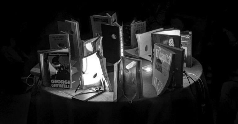 Unter einer industriellen, mystischen und aquatischen Klangatmosphäre taumeln drei Figuren mit Buchmasken durch den Raum und erzeugen Formen, Schatten und Bewegungen. Erscheinung und Auflösung verschmelzen zu einer neuen Version der für das ACC vorgeschlagenen Lecto-Skulptur.