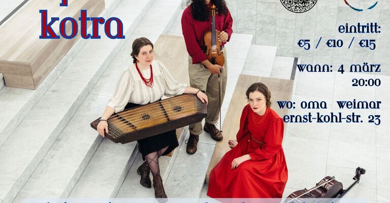 Das in Vilnius ansässige belarussisch-australische Folk-Trio Kapela Kotra (Violine, Cello, Cimbalom) spielt traditionelle Instrumental- und Vokalmusik aus Belarus, der Ukraine, Litauen und Polen zum Zuhören und Tanzen. Die Band arbeitet mit einem Repertoire aus Feldaufnahmen des frühen 20. Jahrhunderts und arrangiert diese alten Melodien so, dass sie ihre historische Authentizität bewahren und gleichzeitig eine frische, lebendige Interpretation bieten.
