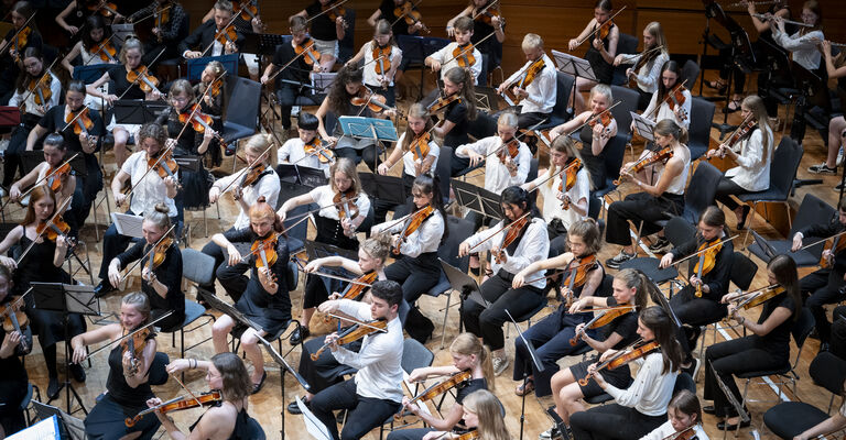 Im Abschlusskonzert des Thüringer Orchestertreffens am 14.6.26 in der Weimarhalle musizieren Kinder und Jugendliche der Musikschulen Altenburger Land, Erfurt, Gotha, Jena, Saale-Holzland-Kreis, Saale-Orla-Kreis, Wartburgkreis und Weimar.