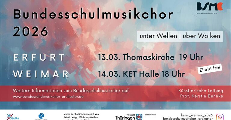 Im März 2026 wird Weimar zum Treffpunkt angehender SchulmusikerInnen aus ganz Deutschland: Der BundesSchulMusikChor (BSMC) des BundesSchulMusikChor & -Orchester e.V. (BSMCO) kommt zu seiner nächsten Chor-Arbeitsphase zusammen. Rund 80 Studierende erarbeiten unter der Leitung von Prof. Kerstin Behnke ein anspruchsvolles Chorprogramm zum Thema „unter Wellen | über Wolken“ – mit Werken von Jaakko Mäntyjärvi, Johannes Brahms, Katerina Gimon und Andrea Tarrodi.