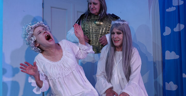 Eine himmlische OffenbarungZwei Engel auf ihrer Wolke - Corona Schröter, die erste Schauspieldiva Weimars und ihre Kammerjungfer Wilhelmine Probst. Gemeinsam blicken sie auf das heutige Weimar und auf ihre künstlerischen Anfänge in dieser Stadt ... Die Hoffnung auf den von Goethe versprochenen epochalen Theaterneuanfang, das Warten darauf und die Tristesse der Provinz ... Und Goethe, der über allem schwebte und von dem alles abhing ... Und dann ist da noch dieser Erzengel Gabriel - der nervt ... Mit Regine Heintze als Corona Schröter, Heike Meyer als Wilhelmine Probst und Detlef Heintze als Erzengel Gabriel. Schauspiel von Walter Hesse.